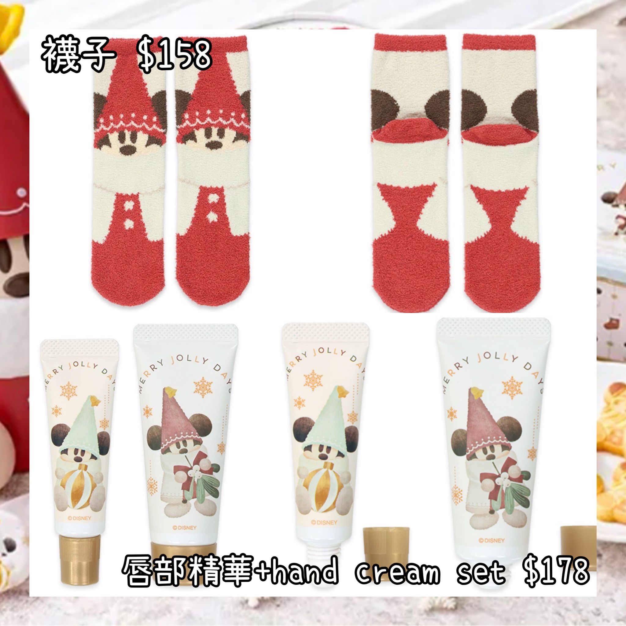 :日本:DISNEY CHRISTMAS 2025 DISNEYLAND園區產品 RING RING MERRY JOLLY DAYS 10/11 日本發賣 襪子 唇部精華 HAND CREAM SET