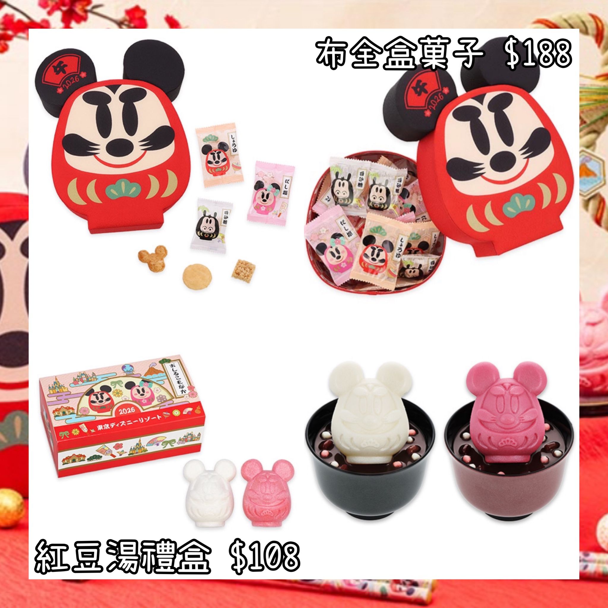 :日本:DISNEYLAND園區產品 正月 2026 NEW YEAR 1/12 日本發賣 布全盒菓子 紅豆湯禮盒
